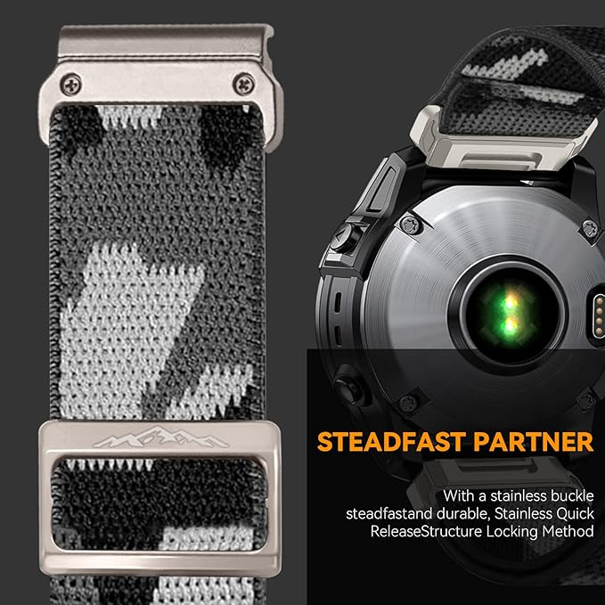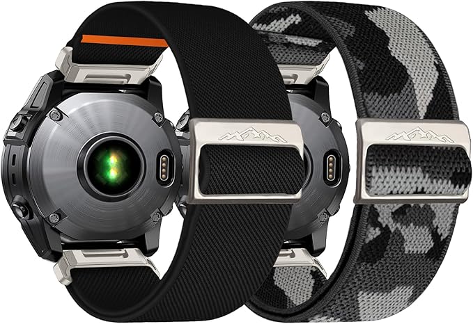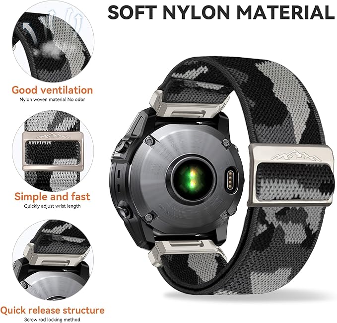 • 【User-Friendly Material】Compatible with Garmin Fenix 6x/Fenix 5x/Fenix 7x bands elastic nylon braided strap is made of high quality stretchy nylon, super soft and lightweight, breathable and comfortable. This eco-friendly nylon and the sweat-absorbing property make this strap super skin-friendly.