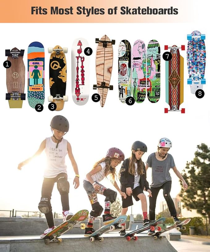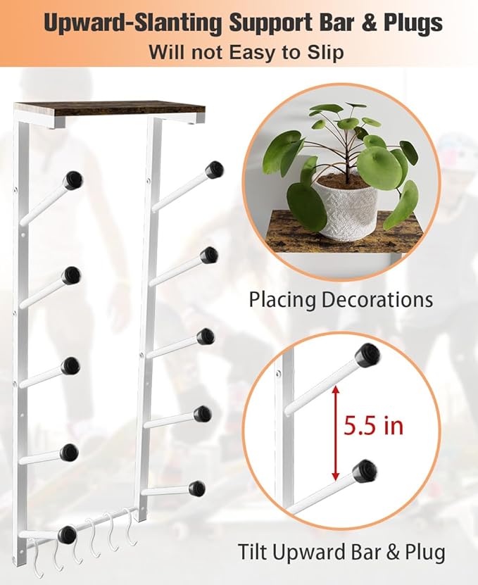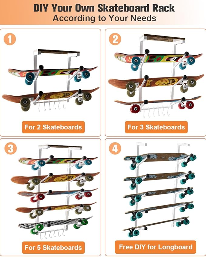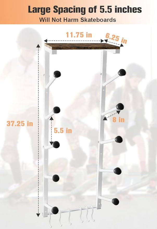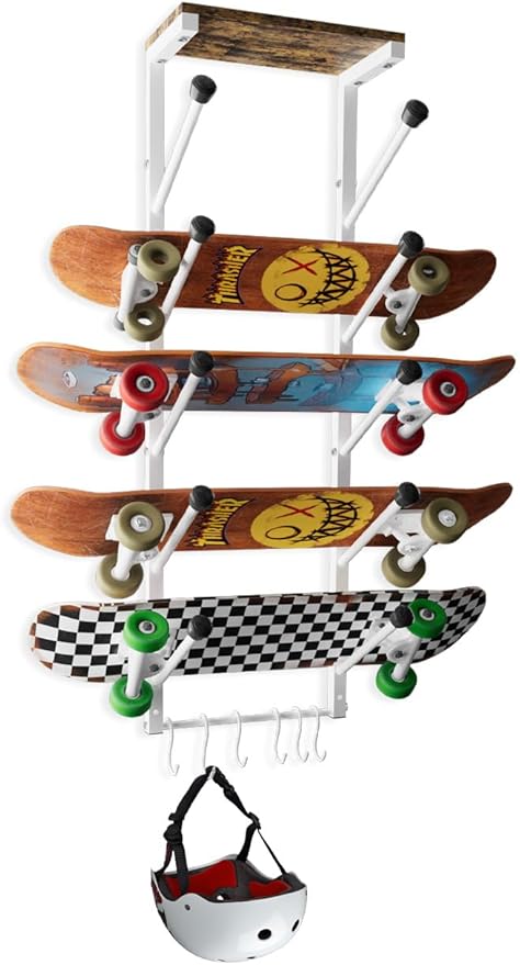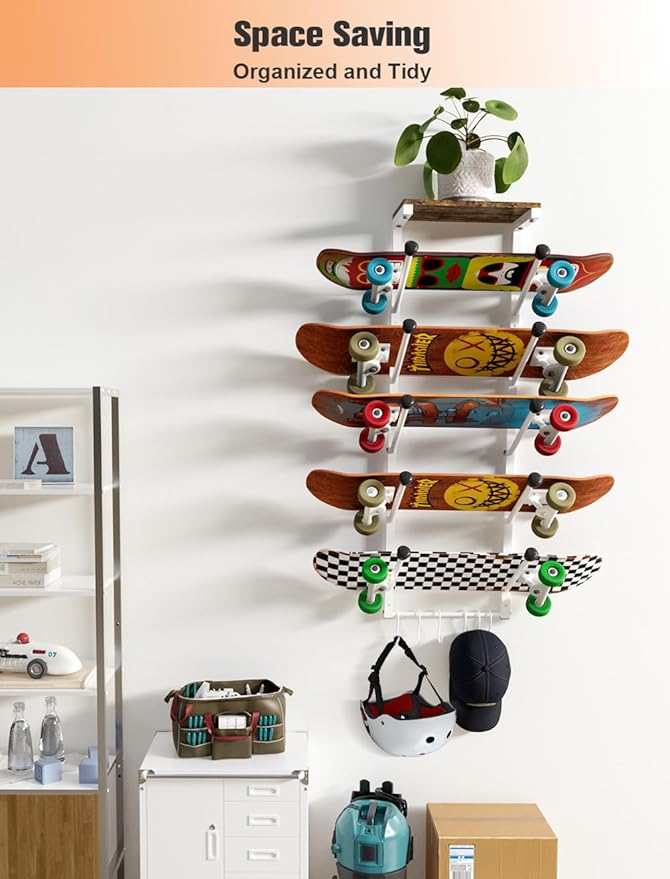 - 【LARGE CAPACITY & SPACE-SAVING】The wall-mounted skateboard rack holds up to 5 skateboards, offering ample storage while saving space. It includes a top shelf and 6 bottom hooks for storing additional skateboard gear like helmets, pads, backpacks, shoes, and gloves. This makes it a stylish addition to living spaces, bedrooms, and garages, keeping everything organized and tidy.