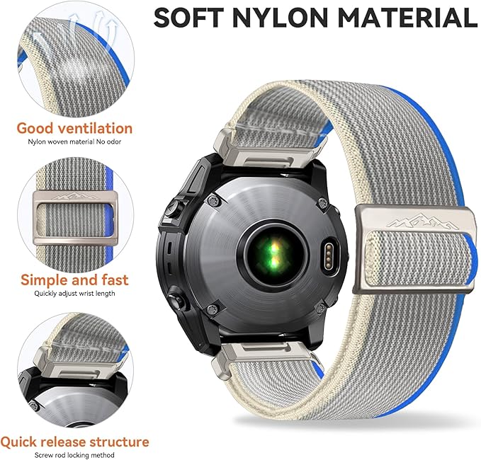 • 【User-Friendly Material】Compatible with Garmin Fenix 7/7 Pro/Fenix 6/6 Pro/Fenix 5/5 Plus Band Elastic Nylon Braided Strap is made of high quality stretchy nylon, super soft and lightweight, breathable and comfortable. This eco-friendly nylon and the sweat-absorbing property make this strap super skin-friendly.