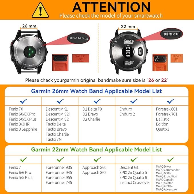 • 【Compatible Model 】Chinber 22mm Watch Band Compatible with Garmin Fenix 7/7 Pro, Fenix 6/6 Pro, Fenix 5/5 Plus, Forerunner 935/945/955/965/745. for Garmin Approach S60/Approach S62 , Descent G1, EPIX 2 N Quatix 5/Quatix 6, Instinct Crossover, Commander/Captain (Gen 2)/Aviator (Gen 2)/Athlete (Gen 2)/Adventurer (Gen 2).ONLY watch strap, NOT included SmartWatch.