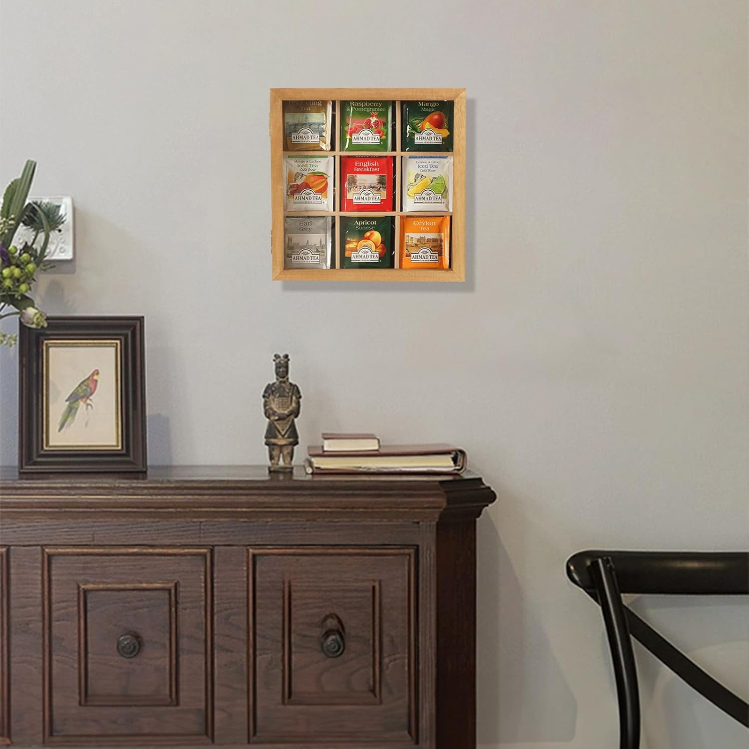 - Multi-Purpose Design: The dividers can be removed to turn it into a shadow box. The back panel has two holes and includes nails for easy hanging on the wall. In addition to tea bags, This tea box can display anything you want, such as teacups, crafts, dried flowers, photos,etc.