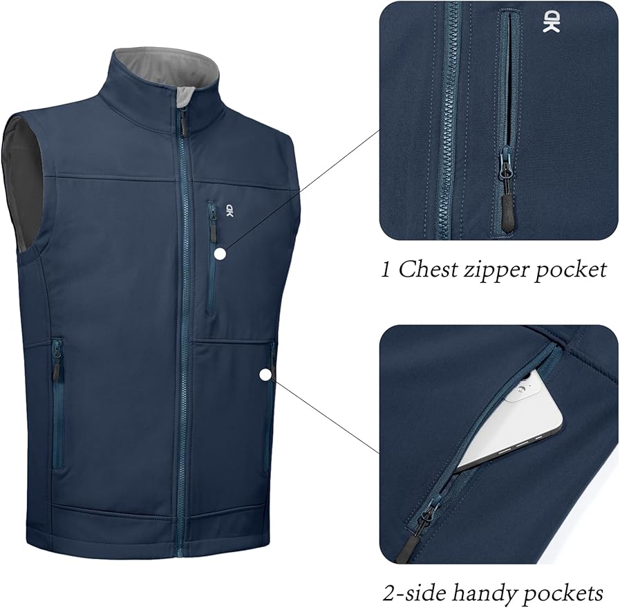 • Outdoor Vest for Men ---- This men's vest is made of soft shell fabric which is smooth with a little stretch, wipes off easily and is washable. Resists abrasion and scratches, great for work and outdoor activities such as golf, running, jogging, hiking, fishing, climbing, cycling, traveling,workout and so on. Keeping you warm and comfortable