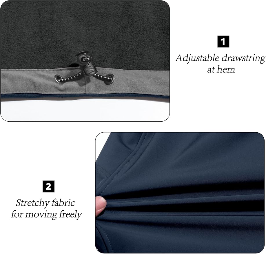 • Windproof & Lightweight ---- Stand neck collar with a wind guard under the zipper and the adjustable elastic drawstring at the hem helps to fit better and seal out the elements as a windbreaker. 3-layered compounding technology but lightweight shell fabric make it durable without being too baggy so that you can wear it out as socially cloth as well as a sportswear