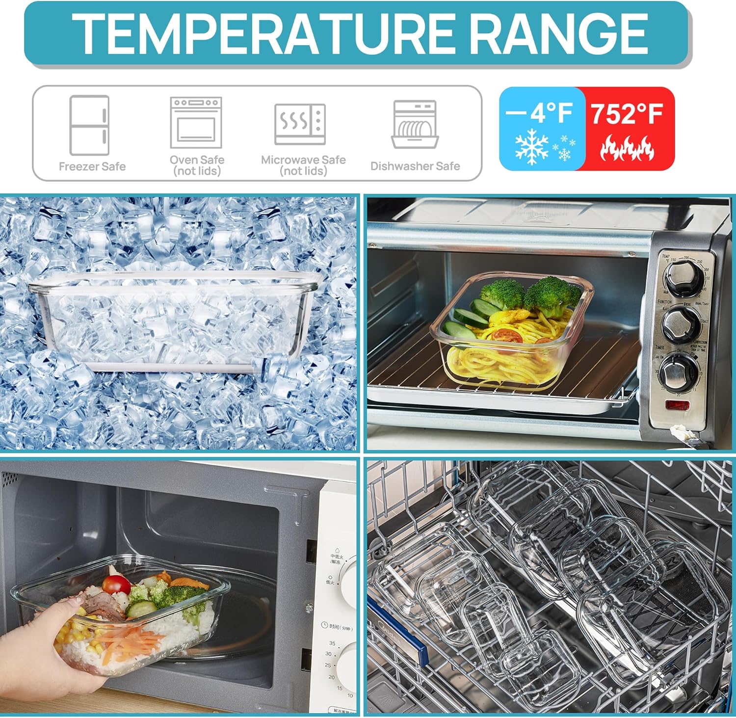 - 【MULTI-APPLIANCE DURABILITY】Oven-safe borosilicate glass withstands -20°C to 400°C (-4°F to 752°F) for seamless transitions from freezer to oven. Microwave compatible (lid removed), dishwasher-friendly, and freezer-ready—built to streamline kitchen workflows.