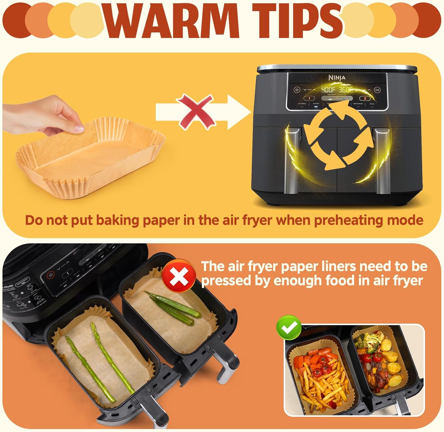 - Heat Resistant Up To 450°F/230°C: Elevate your cooking with our parchment paper for air fryer, tailored for Ninja air fryers. Crafted from untreated wood with a silicone coating, With a water-proof, oil-proof, non-stick, and heat-resistant design, they ensure health cooking every time. Remember, when using the air fryer paper, Please do not put the airfryer liners in the air fryers while preheating! always try to fill it with food as much as possible