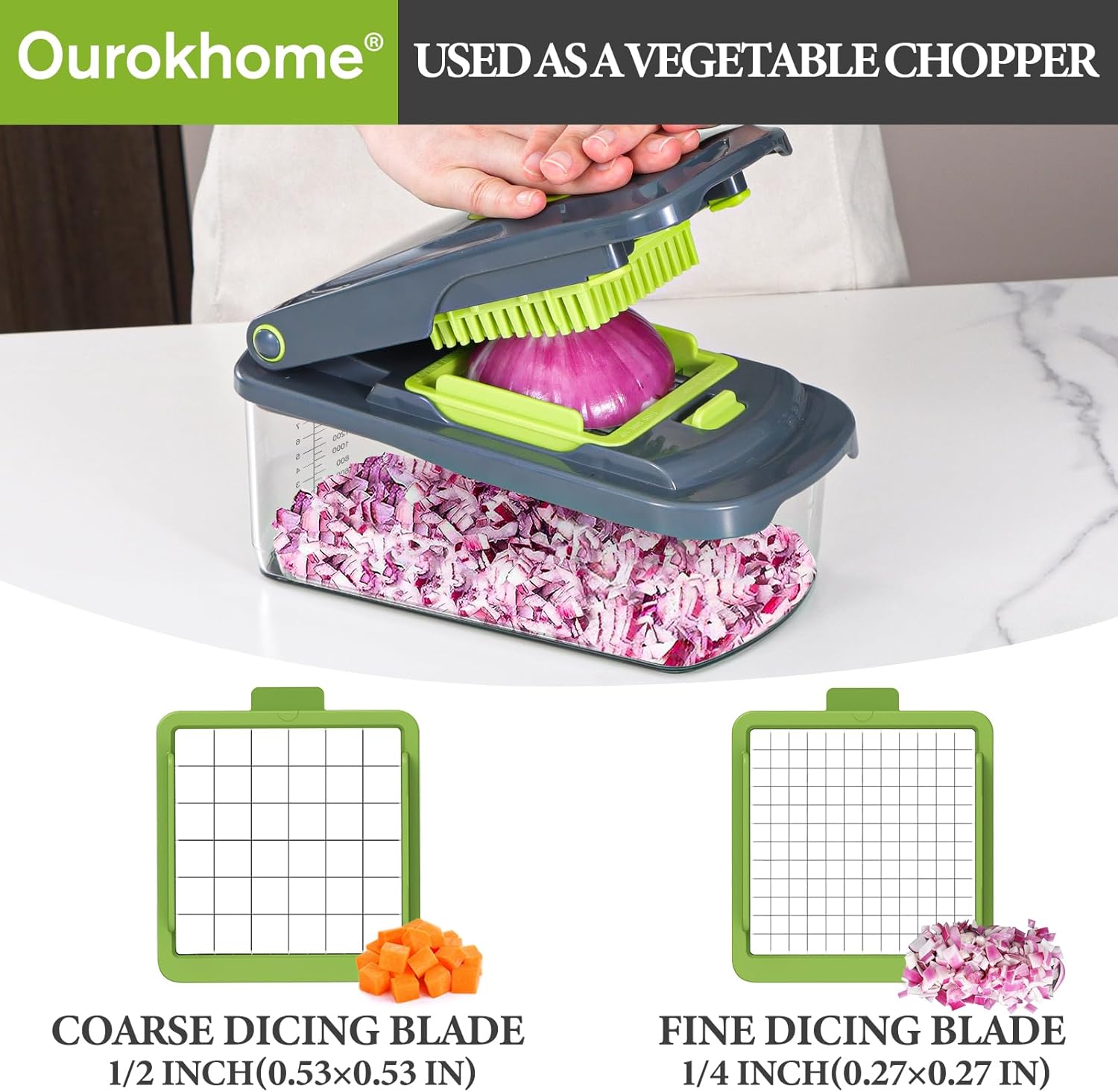 - The onion chopper with container significantly enhances your efficiency in daily life: The 2 interchangeable blades are crafted from high quality stainless steel, ensuring resistance to bending and rusting. They are razor-sharp for effortless ingredient preparation. A clear container features a scale for precise measurement of ingredients, and reinforced to enhance overall durability. This chopper greatly simplifies your cooking experience, eliminates the tedious task of meal preparation and saves your time