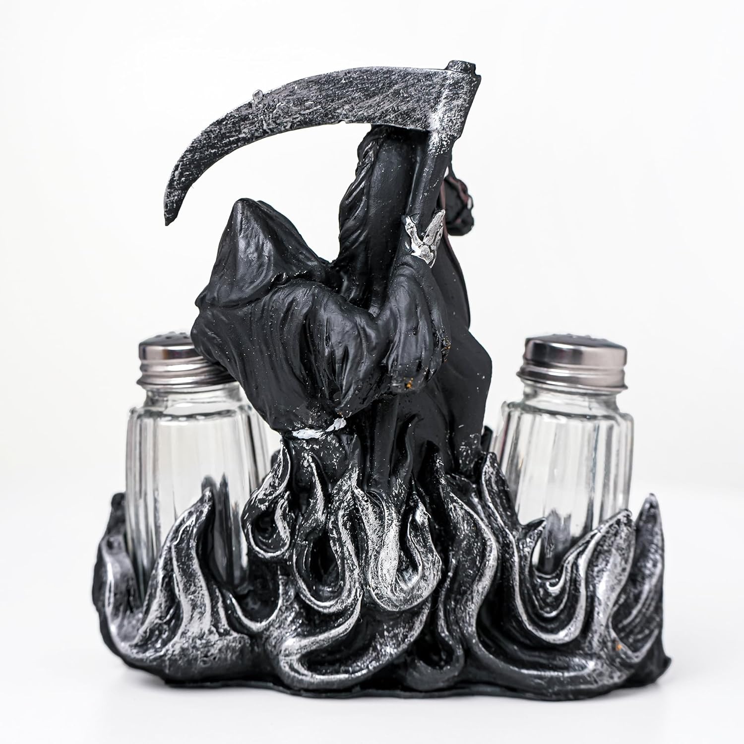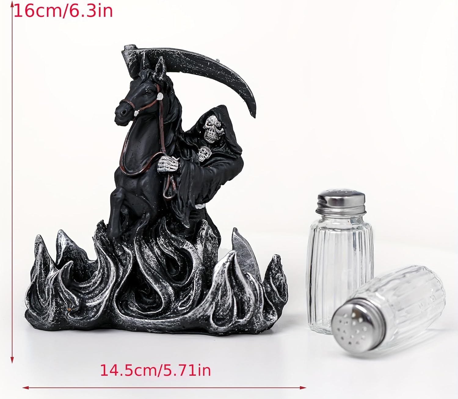 Black Holy Death Statue Shaker Holder - Salt And Pepper Dispenser with Resin Grim Reaper Figurines And Collectibles Holder - Farmhouse Kitchen DéCor with Glass Spice Jars