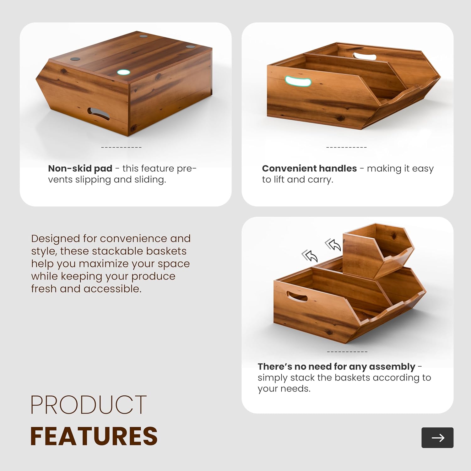 - Non-Skid Pad: Each bin is equipped with a non-skid pad on the bottom, securing that the wooden baskets stay securely in place, whether stacked or used separately.