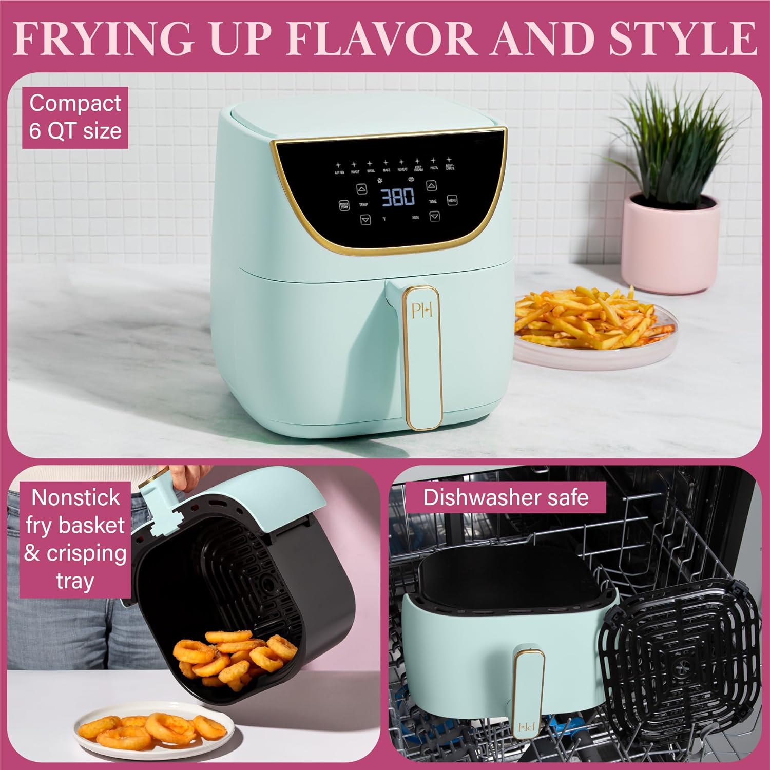 Paris Hilton Air Fryer, Large 6-Quart Capacity, Nonstick Made without PFAS, Touchscreen Display, 8-in-1 (Air Fry, Roast, Broil, Bake, Reheat, Keep Warm, Pizza, Dehydrate), Dishwasher Safe, Aqua