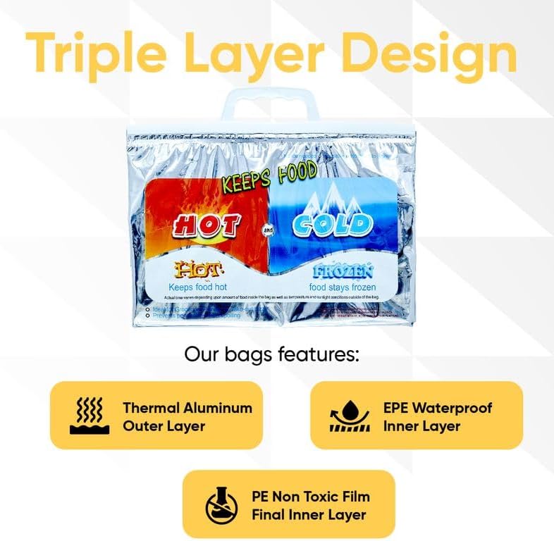 - ✅ TRIPLE LAYER DESIGN - Most other bags are single layer and aren't efficient at maintaining internal temperatures or will start to leak moisture. Our bags feature a sturdy thermal aluminum outer layer, an inner EPE (eco friendly plastic) waterproof layer and a final inner PE non toxic film layer.