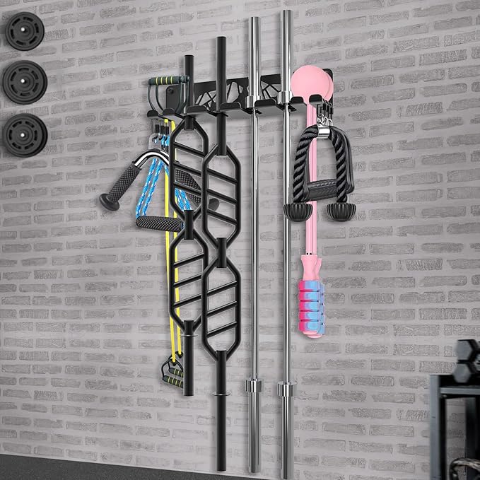 - 【Space-Saving Design】Keep your gym organized with our wall-mounted barbell storage rack. Designed to hold up to 4 barbells and additional fitness accessories, like resistance bands, jump ropes, hooks and other small gym accessories, it’s the perfect solution for decluttering your workout space.