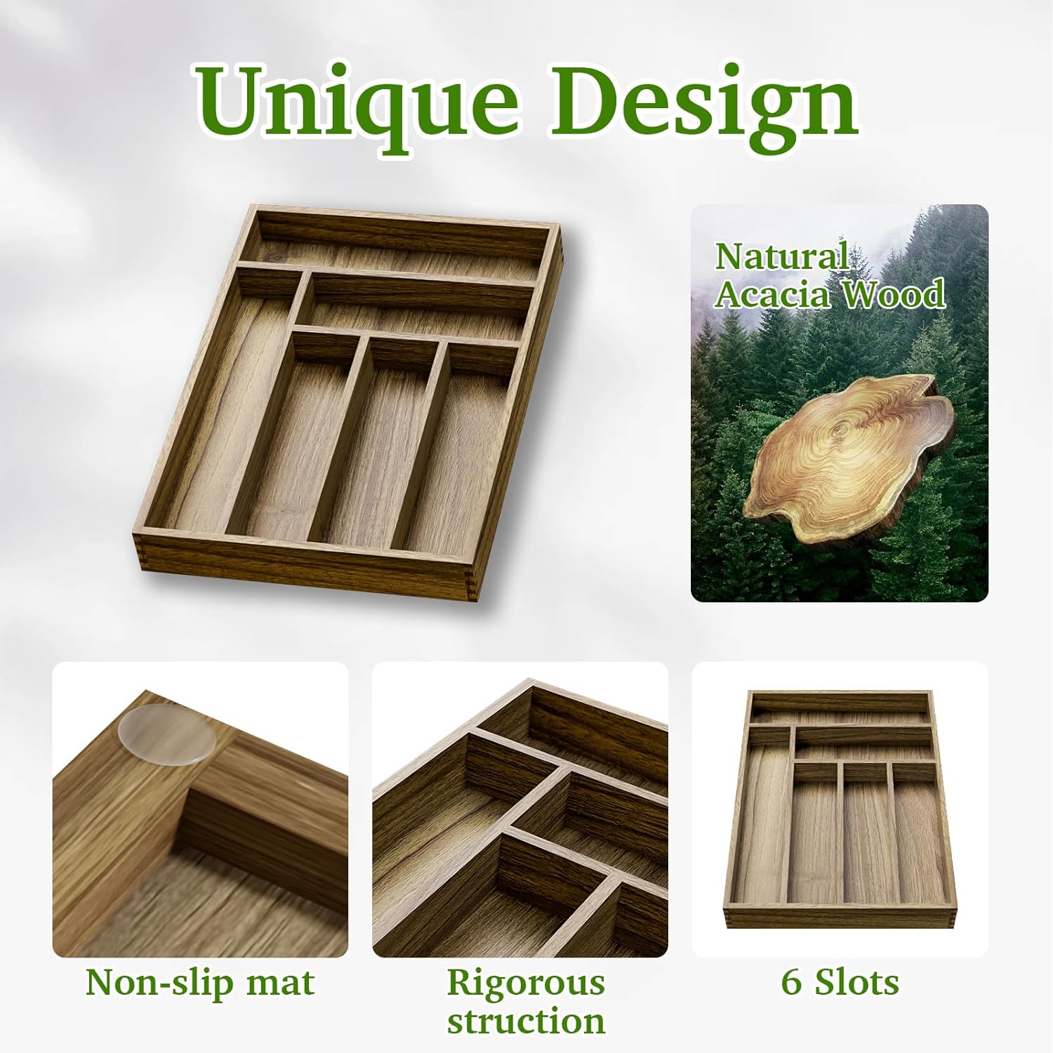 - ๐๐๐ญ๐ฎ๐ซ๐๐ฅ ๐๐๐๐๐ข๐ ๐๐จ๐จ๐-Made of acacia wood, this silverware drawer organizer is very attractive, well made and easy to clean. More resistant than plastic and other materials. The color of natural wood is so beautiful and rich.
