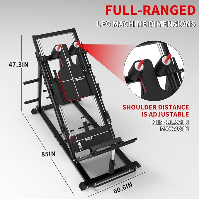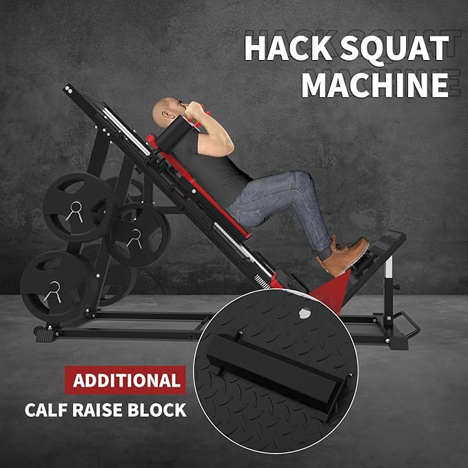 - HEAVY DUTY AND STABLE CONSTRCTURE: Constructed with heavy-duty high tensile solid steel and comfortable professional-grade padding, the 2-in-1 leg press hack squack machine is for long-term use and lasting comfort.The workout machine can hold up to 1500LBS which is a good choice for leg exercise in your home gym. The plated barbell fits 2" (Olympic) size weight plates.