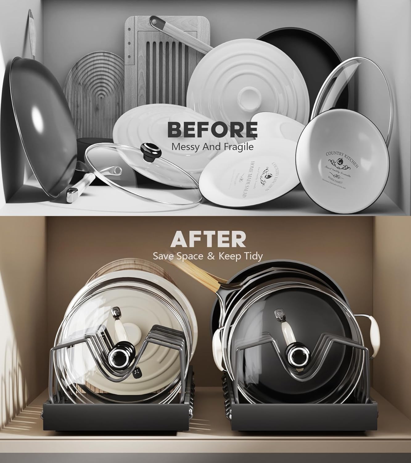 - 【Warm Tip】: Before purchasing, measure the depth and height of your cabinet to ensure that this pot and pan organizer comfortably fits with pans and lids in place. It fit most cabinets and counters but does not fit framed cabinet. Suitable for 6-10 inch lightweight pan. Please ensure that the cabinet width is greater than 10 inches, depth is greater than 20 inches, and height is greater than 12 inches.