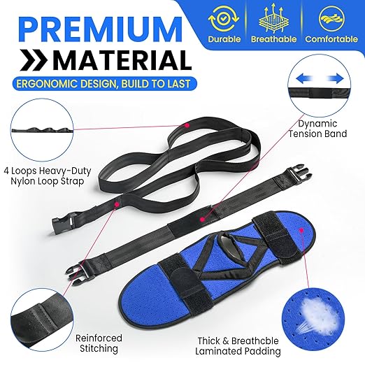 - 【Ergonomic and Comfortable Design】- Unique cradle design made of premium flexible and strong nylon with rigorous stitching for quality performance and durability. It embraces the foot comfortably. The knee stretcher features 4 hand loops that offers multiple grip options for various stretches levels.
