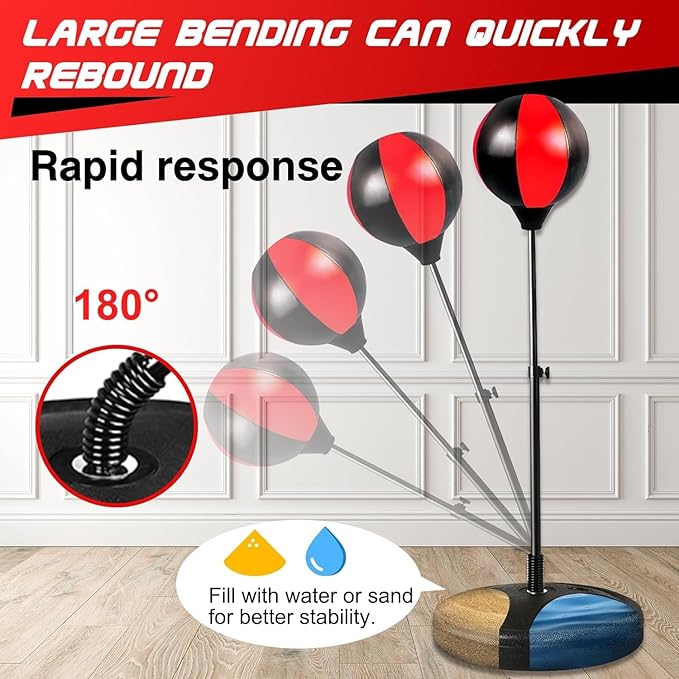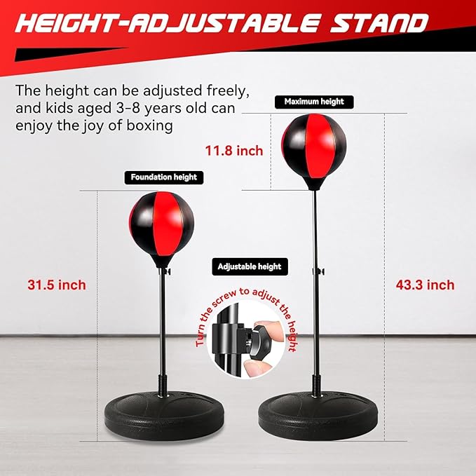 - 【Height Adjustable Stand】: With high-strength steel pipes and a rotating regulating valve design, the boxing ball can be freely adjusted in height according to the child's height. The spring adopts high-strength and resilient spring, with fast rebound speed, which trains the baby's quick reaction ability
