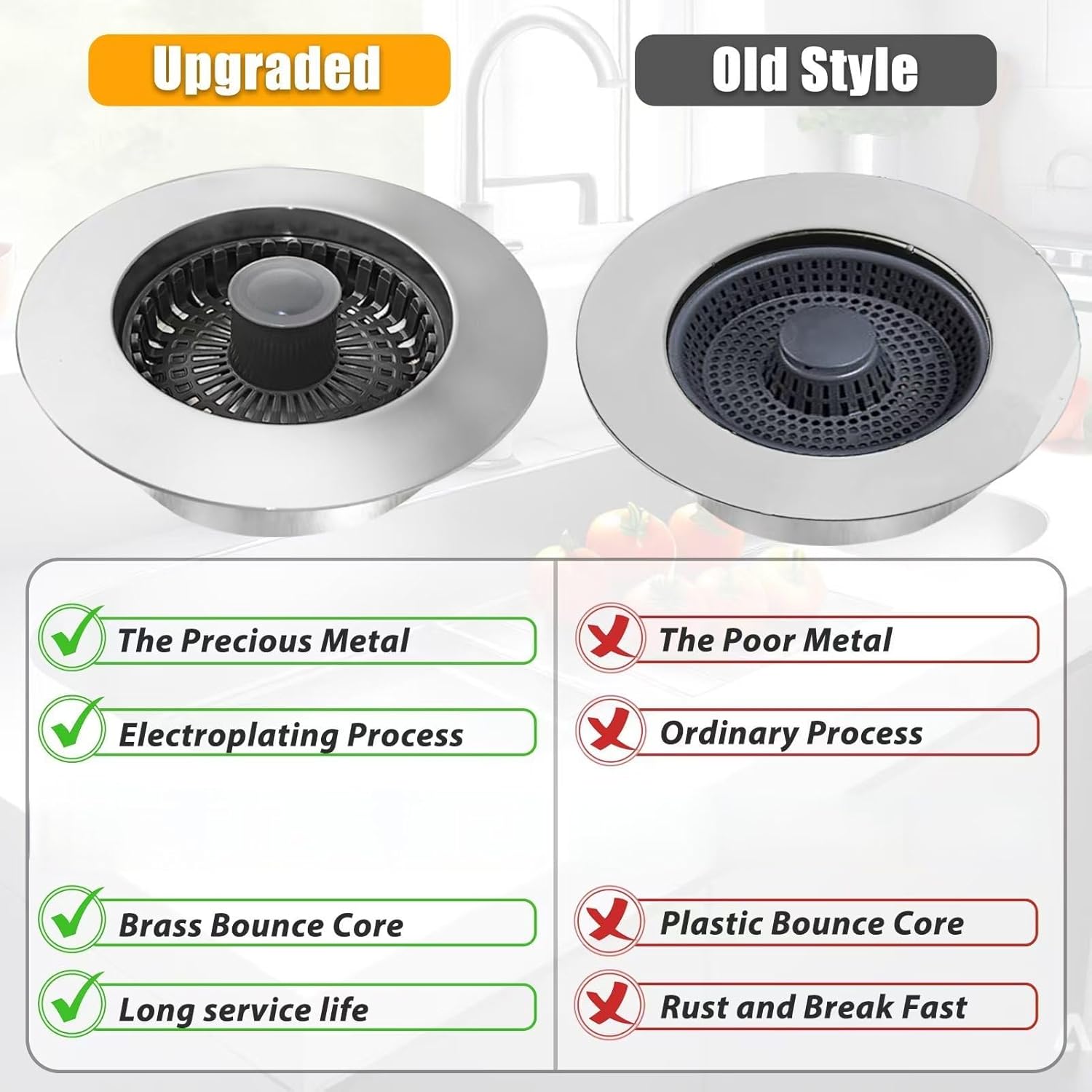 Kitchen Sink Drain Strainer, 3 in 1 Pop Up Kitchen Sink Stopper, with An Extra Basket Strainer, Universal for US Standard 3-1/2 Inch, Chrome Silver