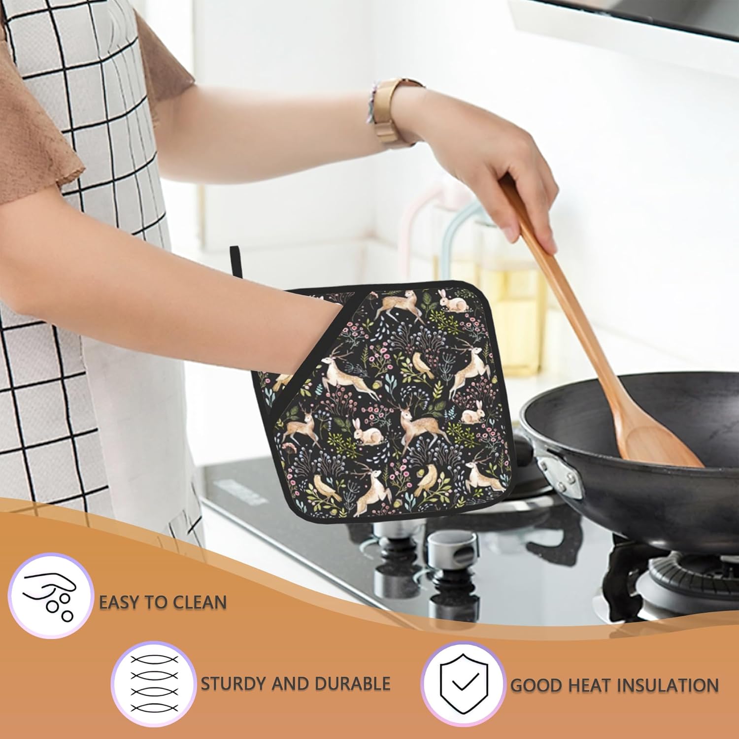 2PCS Forest Deer Pot Holder with Loop,Heat Resistant Oven Pads,Hot Pat for Kitchen Cooking Baking Food