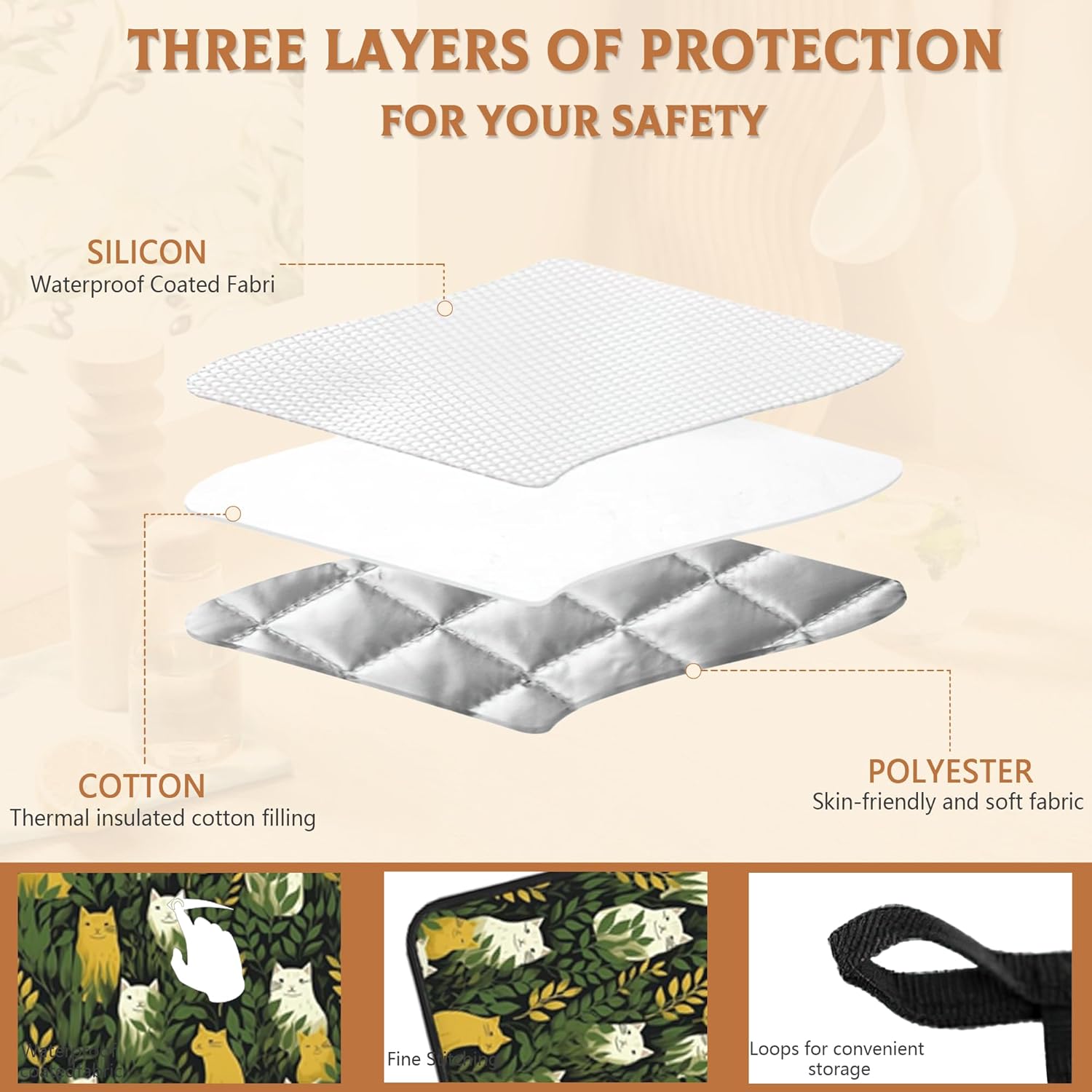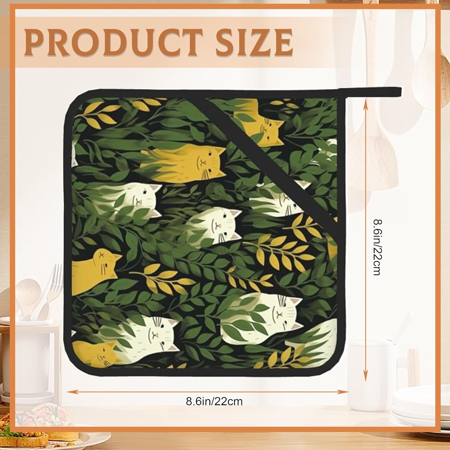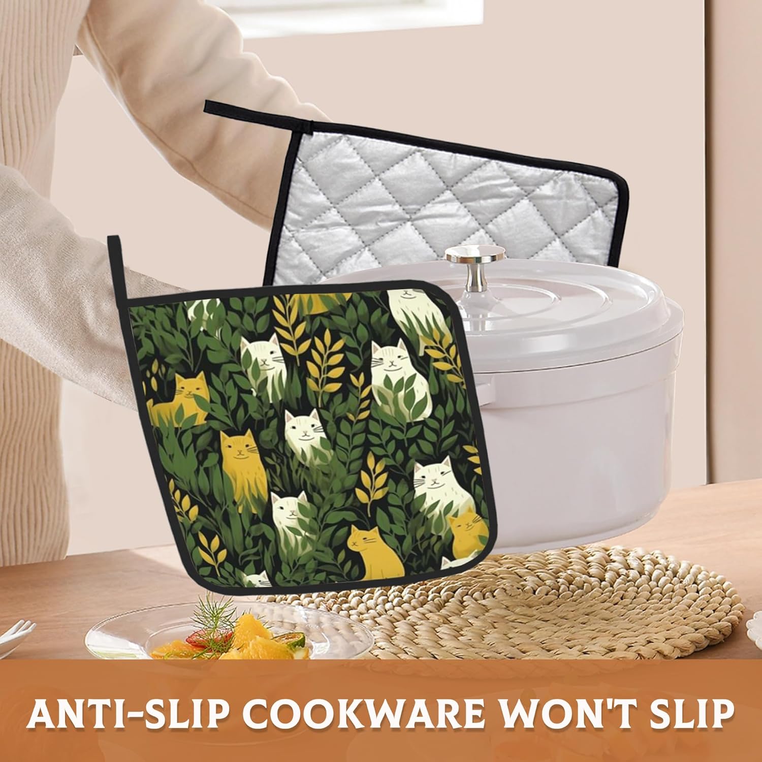 Cute Cats and Green Plants Pot Holder Set of 2,Kitchen Heat Resistant Potholder for Women Men BBQ Cooking Baking