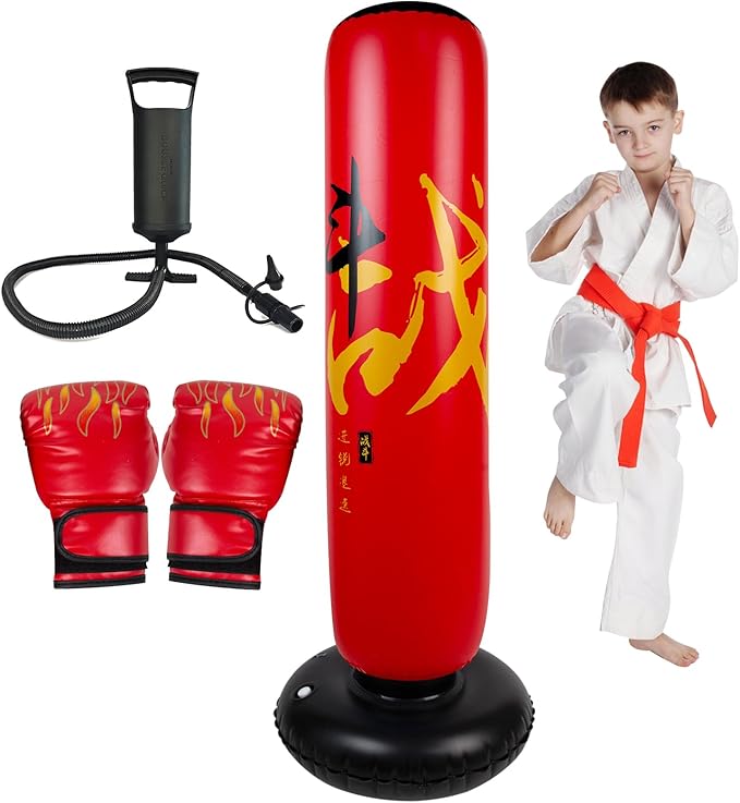 - LARGER KIDS BOXING BAG GIFT SET: When you purchase our Kids Boxing Set,You get a hand inflation pump,A pair of boxing gloves,A 67" Inflatable Kids Boxing Bag,and two patches.Our boxing bag is 67" (H)/168 cm (inflated).Weighs only 3.2 lbs/1.45kg.Lightweight and easy to move.Perfect for kids ages 5-12 years old!