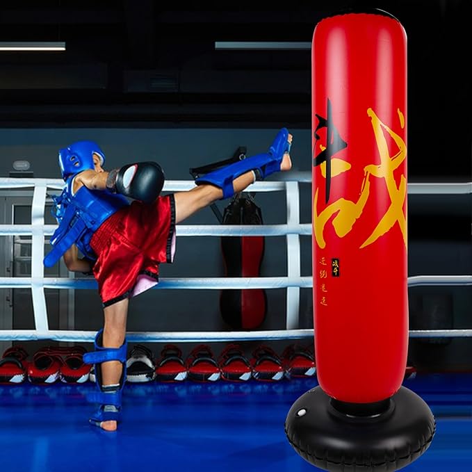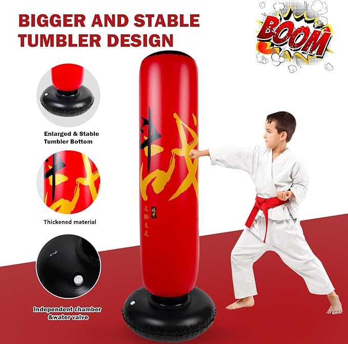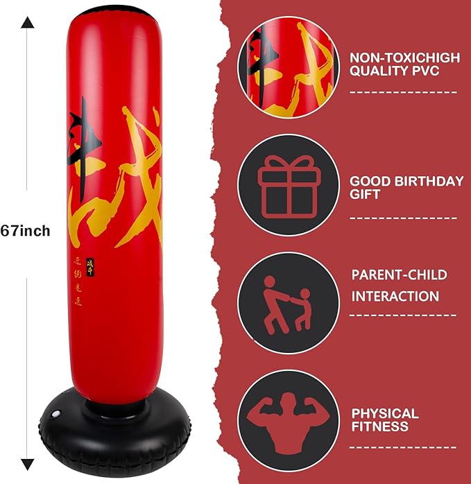 - UNIQUE DESIGN of BOXING BAG PATTERN: Each of our children's inflatable boxing bags is individually designed. For this boxing bag pattern, we have utilized two core Chinese character elements of traditional Chinese martial arts. It makes children passionate about life and learning, brave and fighting spirit. Double-layer air nozzle design, double anti-leakage, long-lasting and durable. The large base is flexible and swings back quickly. Enjoy the good sports time!