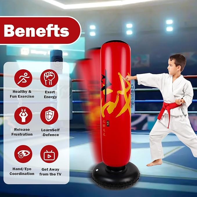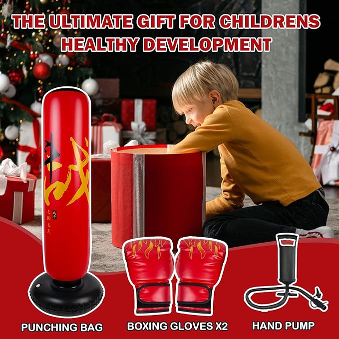 - GIFT FOR KIDS: Inflatable boxing bag for kids is suitable for daily sports and fitness use for children aged 6-12 years old.Usually parents have no time to accompany their children,This boxing bag is the perfect choice for personal interaction.Cultivate your child's comprehensive ability.Keep your child away from cell phones,Exercise your child's hand-eye coordination,Improve concentration, reaction and increase your child's self-confidence.It is a good choice for children's gifts!