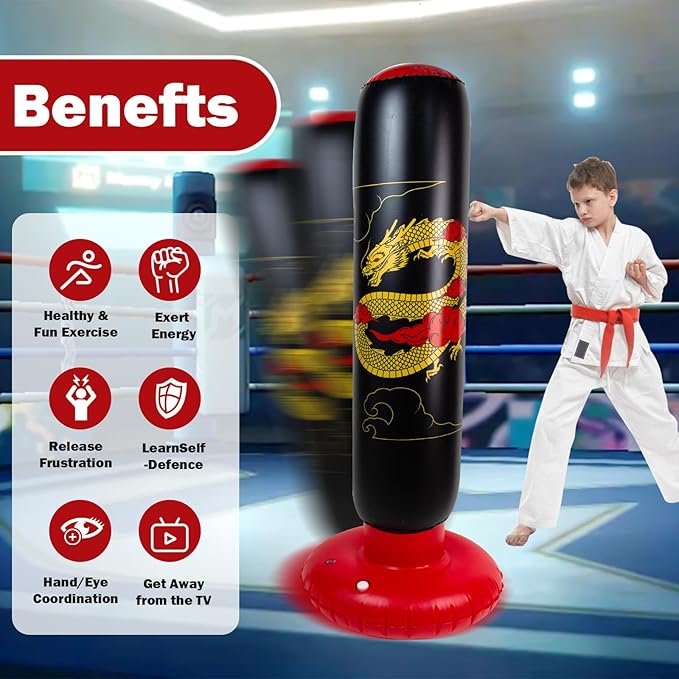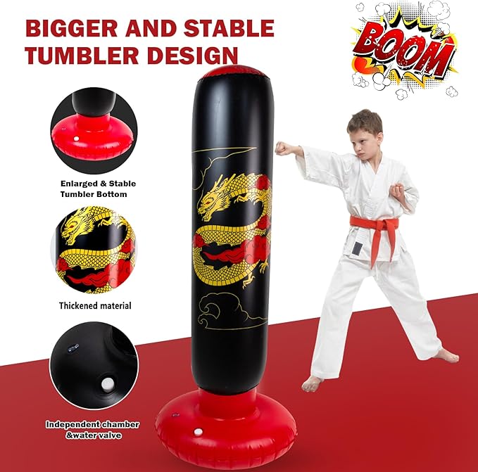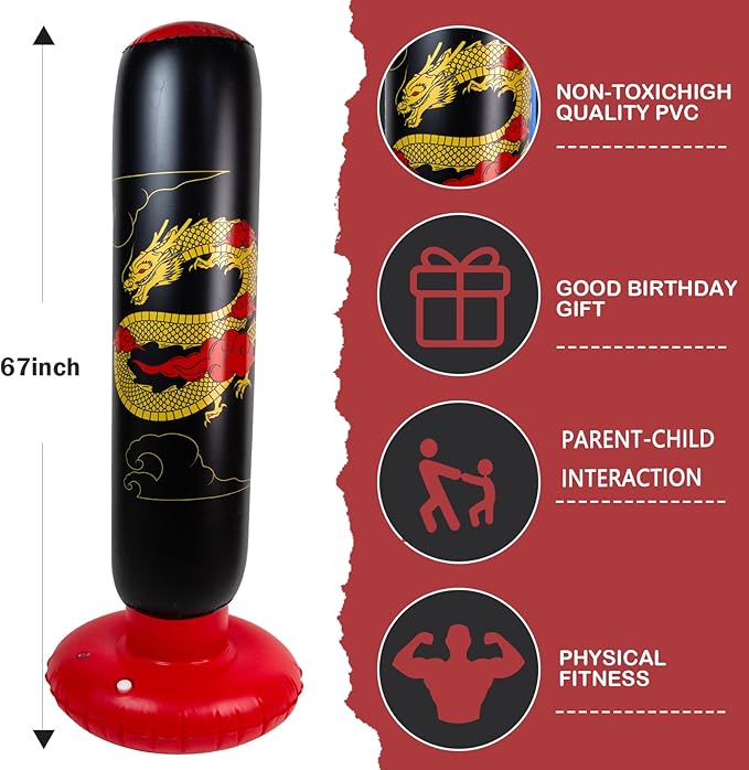 - UNIQUE DESIGN of BOXING BAG PATTERN: Each of our children's inflatable boxing bags is individually designed. For this boxing bag pattern, we used the elements of the golden dragon, the totem belief of the Chinese people. Let the children's life and learning like the golden dragon to flourish, full of passion and courage to fight.Double-layer air nozzle design, double anti-leakage, long-lasting and durable. The large base is flexible and swings back quickly. Enjoy the good sports time!