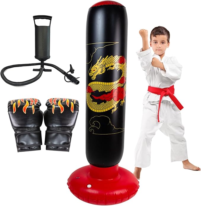 - LARGER KIDS BOXING BAG GIFT SET: When you purchase our kids boxing set,You get a hand inflation pump,A pair of boxing gloves,A 67" inflatable kids boxing bag,and two patches.Our boxing bag is 67" (H)/168 cm (inflated).Weighs only 3.2 lbs/1.45kg.Lightweight and easy to move.Perfect for kids ages 5-12 years old!