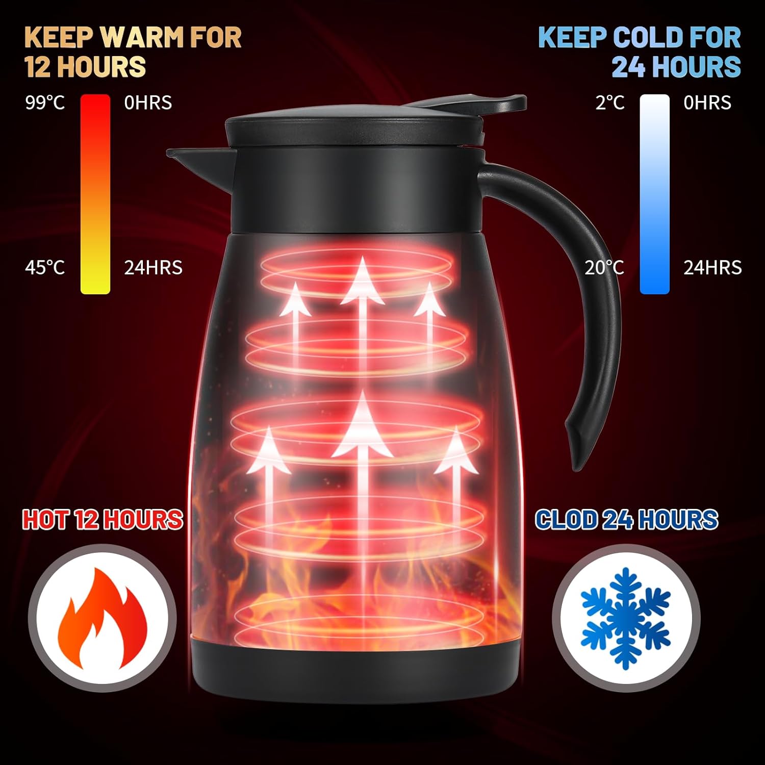 - 12 HOURS HOT & 24 HOURS COLD | This coffee carafe use the insulated vacuum and double walled interior and exteroir technology,ensure that the innner temperature can keep the hot for 12 hours and cold for 24 hours,it can locks in temperature for any beverages and preserve flavour and freshness on any ocaasion.