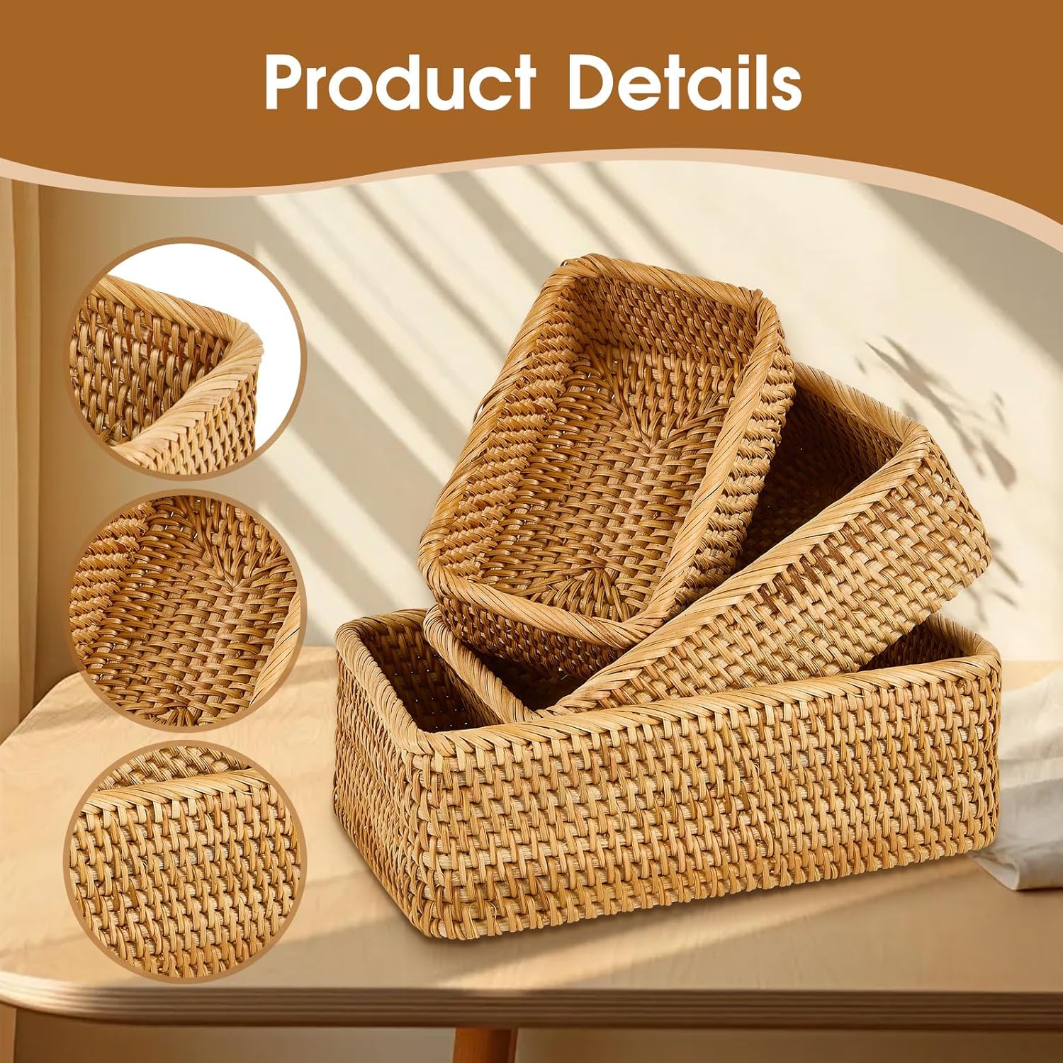 - Handwoven Design: Crafted from natural rattan material, these baskets feature a beautifully woven texture and warm brown hue.
