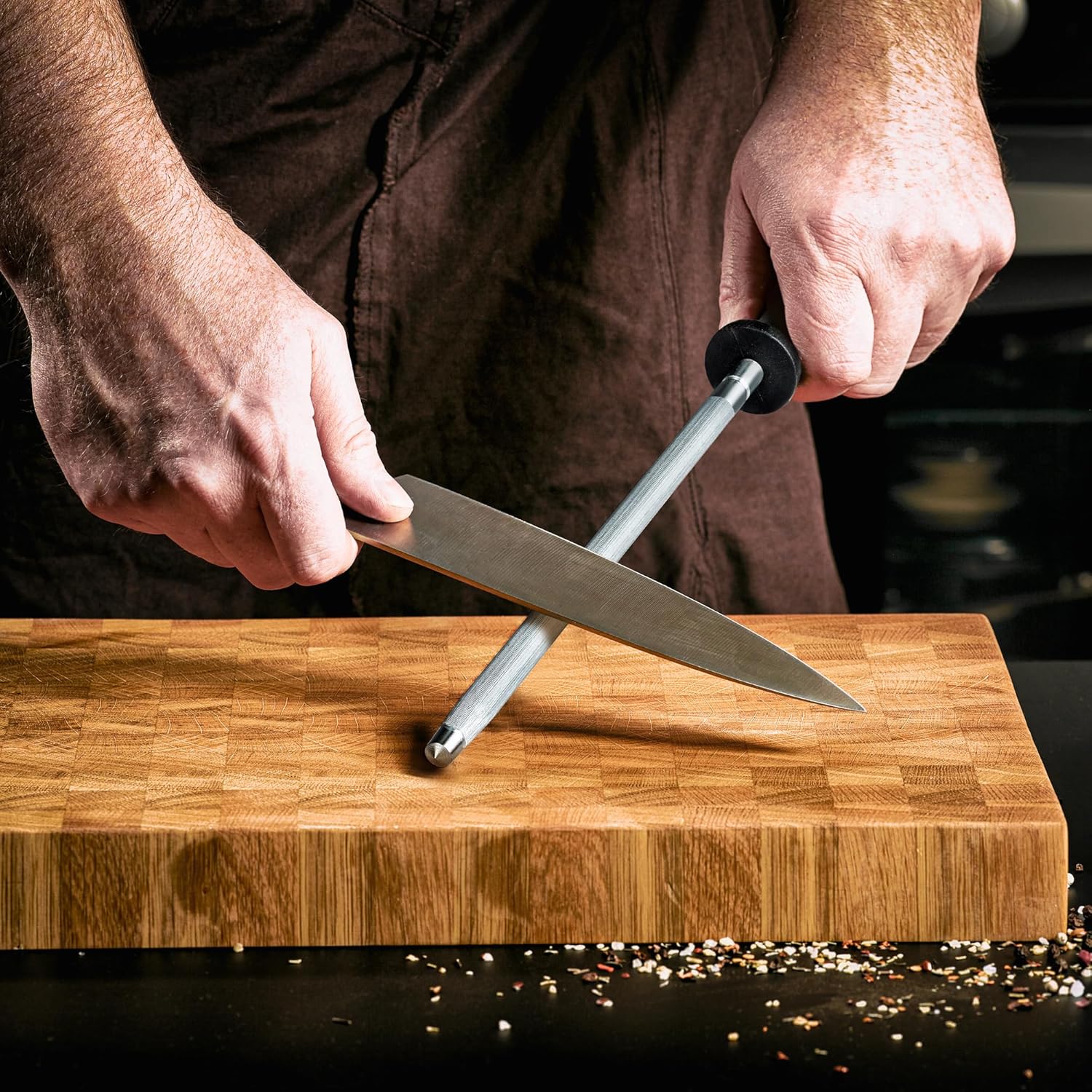 - Premium Construction: Constructed from durable carbon steel and coated with nickel-chrome, our sharpening rod combines longevity with functionality. The finely ground surface of the rod ensures that your knives are sharpened without damaging the cutting edges, preserving the life of your blades.