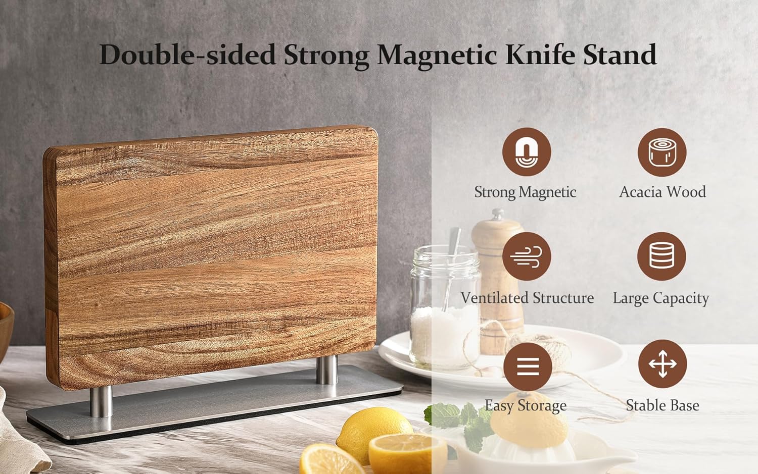 Strong Double Sided Magnetic Knife Block Without Knives, with Acacia Wood+430 Stainless Steel Base,Magnetic Universal Stands with Strong Enhanced Magnets Strip Kitchen Storage Cutlery Large Organizer