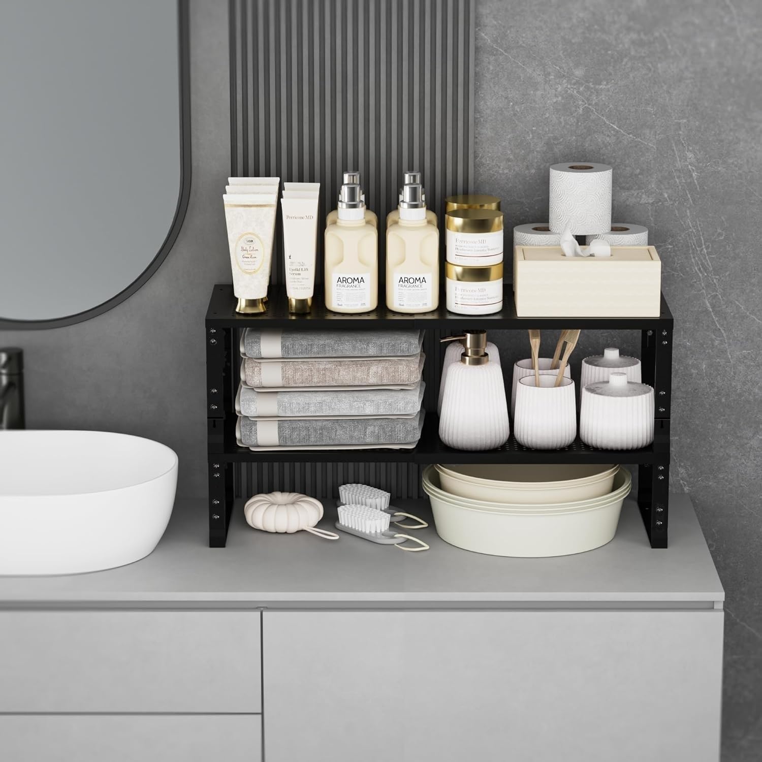 - ⭐【Expandable,Stackable】The shelves can easily expand and contract according to your storage needs, whether it is kitchen clutter or office supplies.You can combine multiple shelves together to form a large storage system, or separate them into several separate smaller units(Measure:10.24"D x 16.54"W~27.17"W x 8.31"H/7.68"H/7.05"H/6.42"H)