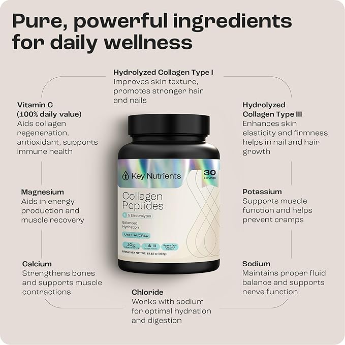KEY NUTRIENTS Collagen Peptides Powder, Multi Collagen Peptides Powder, Collagen Powder Unflavored Electrolytes, Collagen Supplements, Collagen Peptides for Women, Collagen for Men (30 Servings)