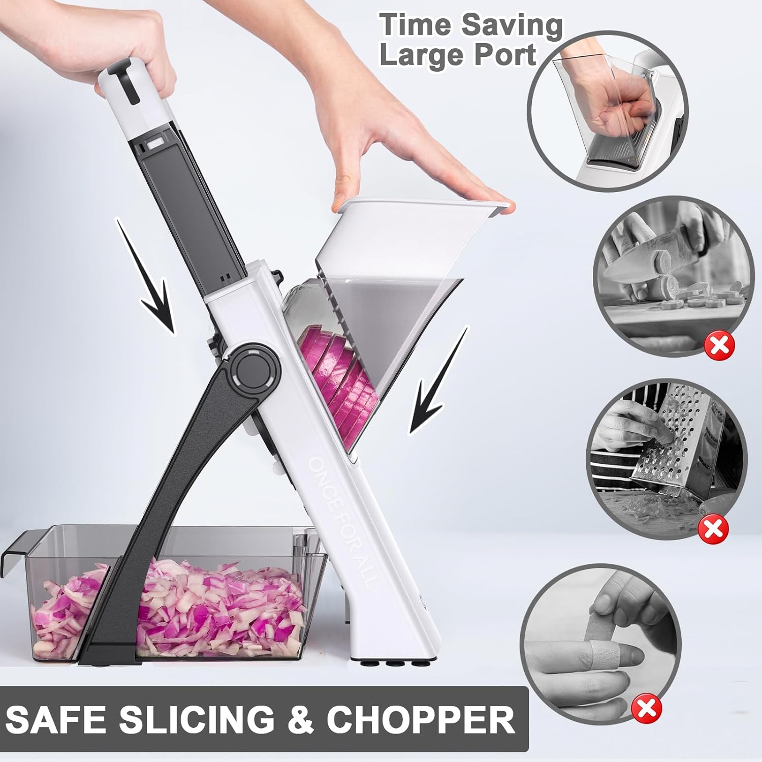 Upgrade Safe Mandoline Slicer for Kitchen, Vegetable Chopper Slicer, Potato Slicer Thickness Adjuster, French Fry Cutter, Veggie Onion Dicer Faster Kitchen Mandolin for Meal Prep (White)