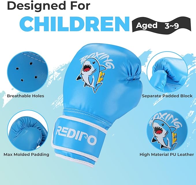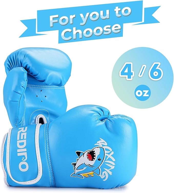 - 【ERGONOMIC DESIGN】-- Ergonomic design with extra-thick protective padding on the knuckles provide ultimate safety in every punch. Redipo 4 & 6 OZ boxing fighting gloves are suitable for kids ages 3-9.