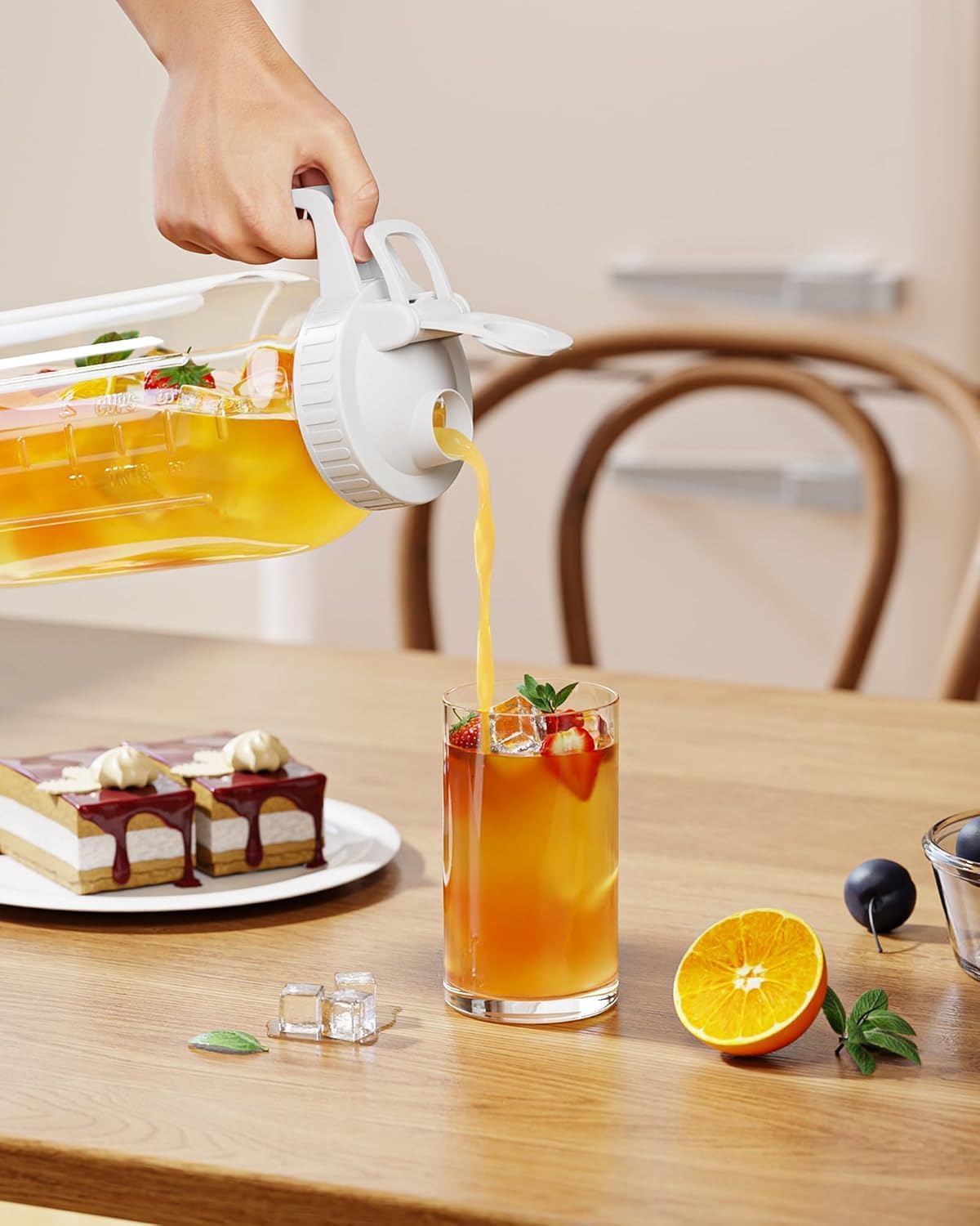 - Keep Your Drinks Fresh and Flavorful: The 64oz glass pitcher features an airtight flip lid with a silicone seal, ensuring your favorite beverages stay fresh and flavorful while being leak-proof. It’s designed for easy and convenient opening, pouring, and closing, making it perfect for storing your drinks