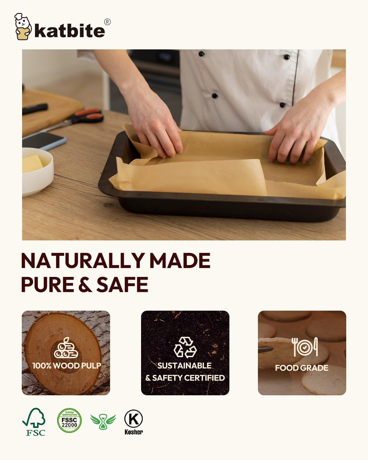- Healthy & Natural: Certified by KOSHER and FSC, katbite parchment paper, part of the product, packaging and wrappings of paper are made from fsc-certified wood. Made from 100% natural wood pulp, our unbleached and fluorescent-free parchment paper ensures reliability without any safety concerns. Featuring food-grade silicone coating on both sides, these sheets provide a safe, non-toxic baking surface.Trust Katbite Balanced Series for a healthy, natural, and sustainable baking experience.