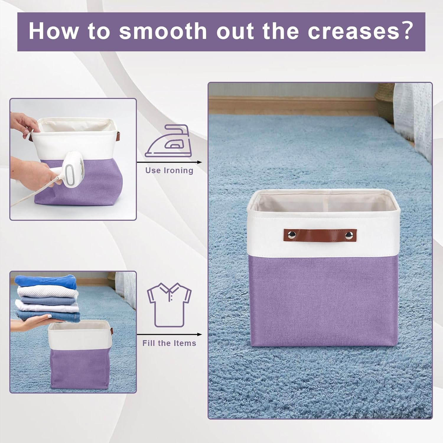 - 【Maintenance & Care Tip】 - Collapsible design for space saving. Our foldable baskets comes in a compression packing which may result in wrinkled storage bin during the long transit. Get rid of the wrinkles by either stuffing the fabric storage bins with blankets and pillows for a few days or steam iron them at low-heat setting. The organization baskets are easy to clean, you can dust the basket with a soft cloth with light soapy water when needed. Not recommended to machine wash.