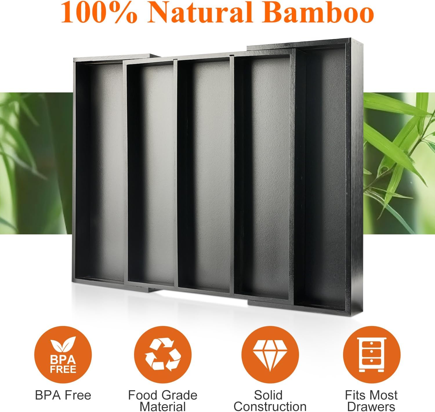 Expandable Large Kitchen Utensil Drawer Organizer Storage Black Bamboo Silverware Organizers Tray Divider Adjustable Spoon Flatware Organizer Wood Cutlery Tray Cooking Utensils Tool Holder Drawer