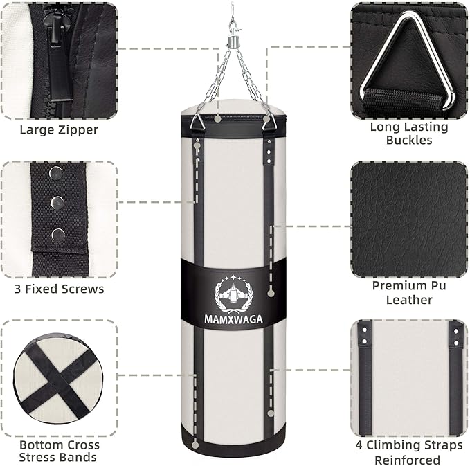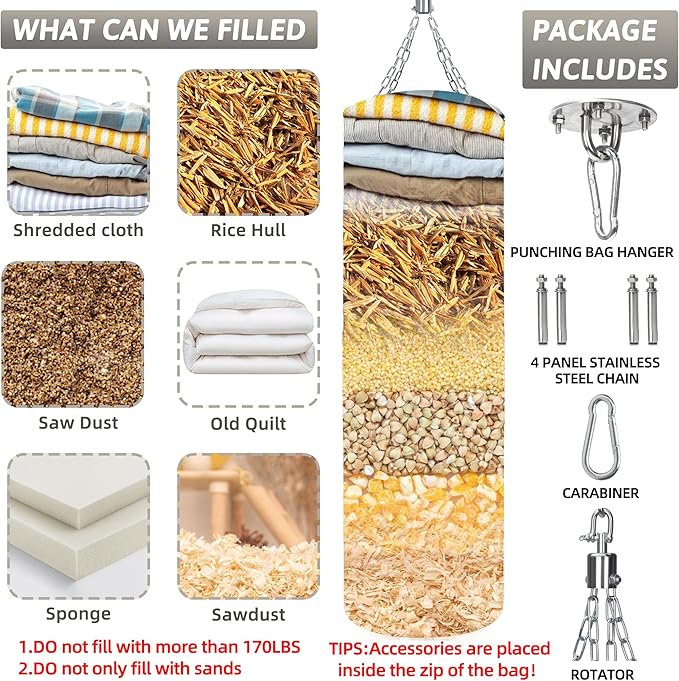 - Easy to Fill : Heavy punching bag is EMPTY, easy to carry and storage. You can fill it up with sawdust, old cloth, shredded cotton fabric, sponge and more. But please don’t only install sand, the filling preferably no more than 100 pounds!