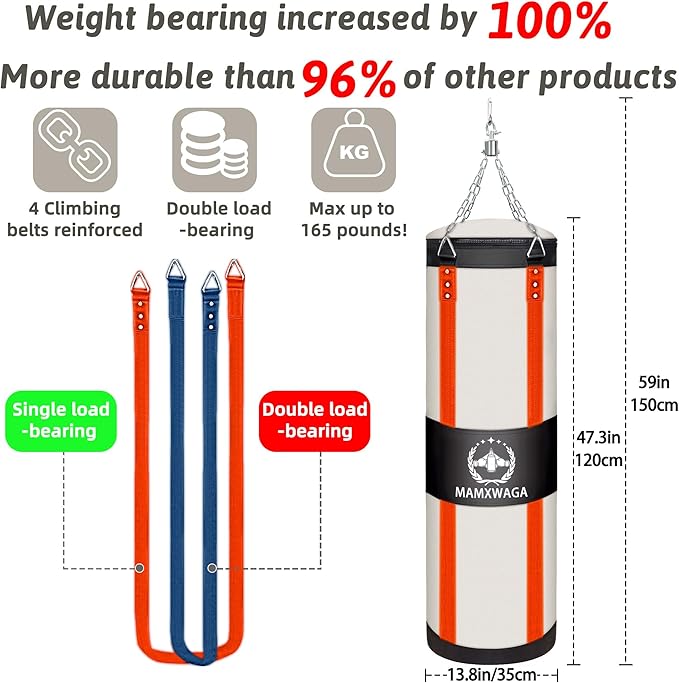 - Double load-bearing capacity: The punch bag has four strong climbing straps stitched on the four sides, This structure supper sturdy and durable 90% than other punch bags, max can hold up to 180 pounds!