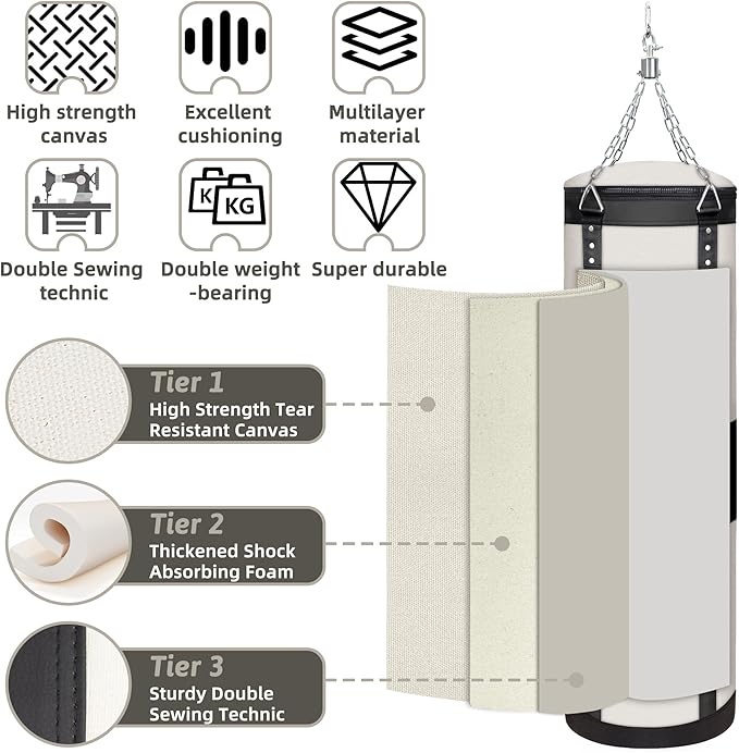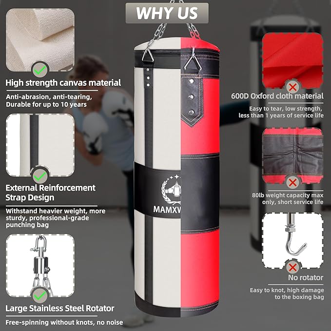 - Super Durable: The canvas punching bag is made from 2.5mm thick highly durable canvas and strong reinforced stitching. Sturdy and durable, long service life