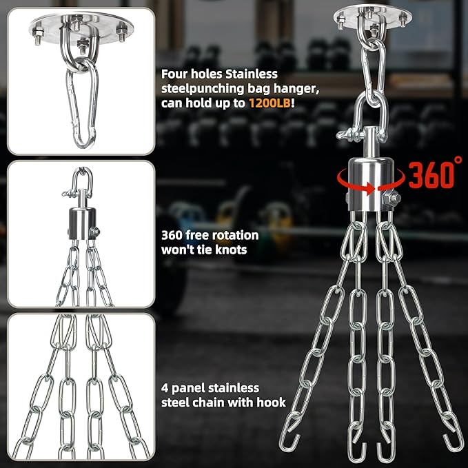 - 360° Swivel Steel-Hanger: 360° swivel Hanger allows the bag to rotate freely without knotting after impact. Equipped with 4 expansion bolts and a carabiner, easy to assemble, it can hold up to 1200LB!