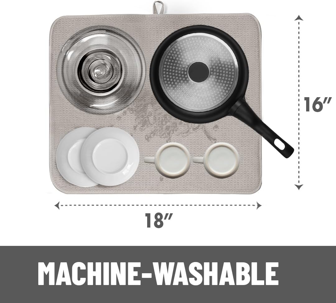 - THICKEST , STYLISH MAT | INNOVATIVE HONEYCOMB WEAVE: Keep your counter spotless even while washing a sink full of kitchen dishes . Our superbly stylish drying mat is among the thickest on the market today , and its innovative honeycomb microfiber structure enhances absorption and quickens drying time . Idea kitchen accessories for countertop