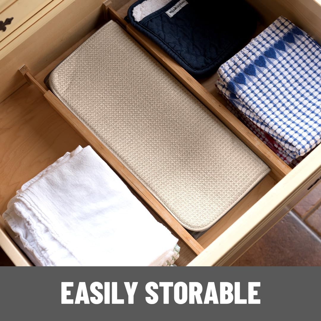 - QUICK-DRY HANG TAG | EASY STORAGE: Our manufacturing process creates naturally strong and durable dish-drying mats . Fold up and toss in a drawer or tuck it elsewhere when not in use , and simply hang with the reinforced tag to dry . Our flexible core , folded between high-tech layers of microfiber , the ideal dish dryer mats .
