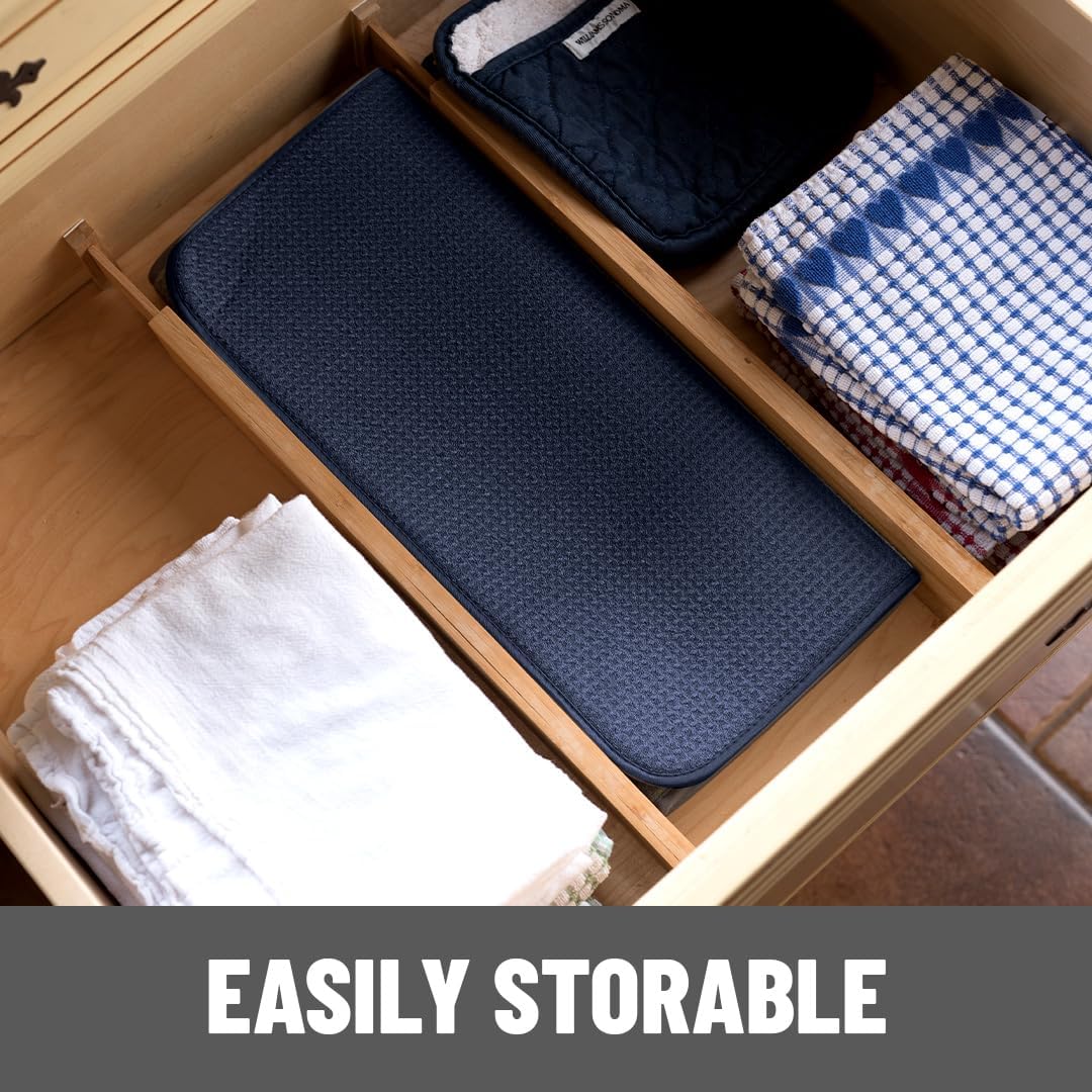 - QUICK-DRY HANG TAG | EASY STORAGE: Our manufacturing process creates naturally strong and durable dish-drying mats . Fold up and toss in a drawer or tuck it elsewhere when not in use , and simply hang with the reinforced tag to dry . Our flexible core , folded between high-tech layers of microfiber , the ideal dish dryer mats .