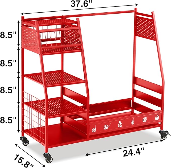 - Easy to Move & Stable When Stationary: The golf club storage stand with storage has 4 wheels that can rotate 360°, and you can push the garage storage stand to wherever you want. 2 of the 4 wheels can be locked, allowing flexible movement while maintaining sufficient stability in the placement position of the golf bag rack holder. The assembled freestanding garage storage station features 37.6'' L x 15.8'' W x 34.3'' H. Please measure where you want to put it before buying