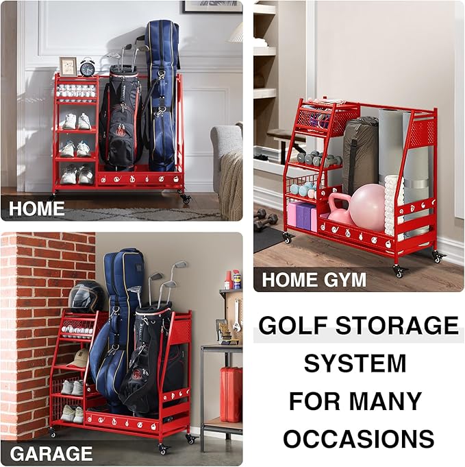 - Multi Occasions: Our golf bag storage can organize almost all your golf accessories, keep your sports and golf equipment in one place, say goodbye to cluttered garages, basements, homes, yoga studios, golf clubs, athletic departments, and storage rooms that are easy to access and space-saving. Christmas is coming up, this superior quality uniquely designed golf rack is the ideal gift for your boyfriend, husband or friends.
