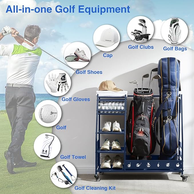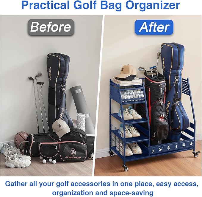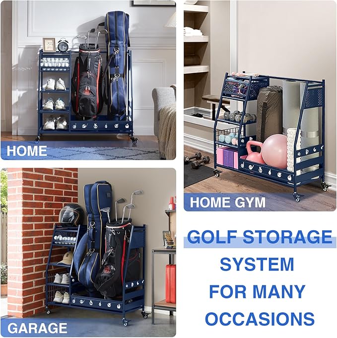 • Multi Occasions: Our golf bag storage can organize almost all your golf accessories, keep your sports and golf equipment in one place, say goodbye to cluttered garages, basements, homes, yoga studios, golf clubs, athletic departments, and storage rooms that are easy to access and space-saving. Christmas is coming up, this superior quality uniquely designed golf rack is the ideal gift for your boyfriend, husband or friends.